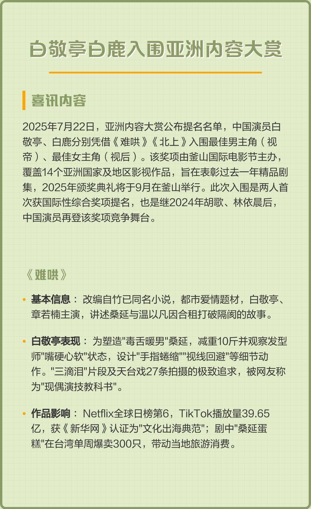 对于演员而言,提名本身就是一种鼓励。白鹿和白敬亭的入围,不仅是个人职业生涯的重要节点,也代表着国产演员在亚洲影视市场中的竞争力正在提升。他们的成长轨迹和作品表现,为行业内的年轻演员提供了参考,也让观众对国产影视的未来发展抱有更多期待。